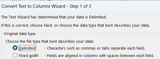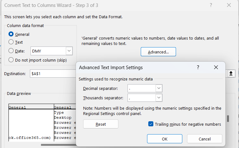 Select Advanced and set decimal separator to "." and thousands separator to "," and press OK and click finish to convert CSV file to columns.