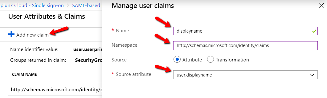 Press Add new claim to add it and fill out the Name, Namespace and Source attribute: