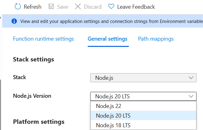 To upgrade nodejs version and runtime version goto the Function app -> Settings -> Configuration and select the "General Settings" tab, upgrade nodejs version to latest LTS, currently 20.
