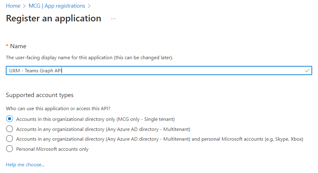 Enter a name for your registration (For example UXM - Teams Graph API) and set to only support "Accounts in this organizational directory only"
