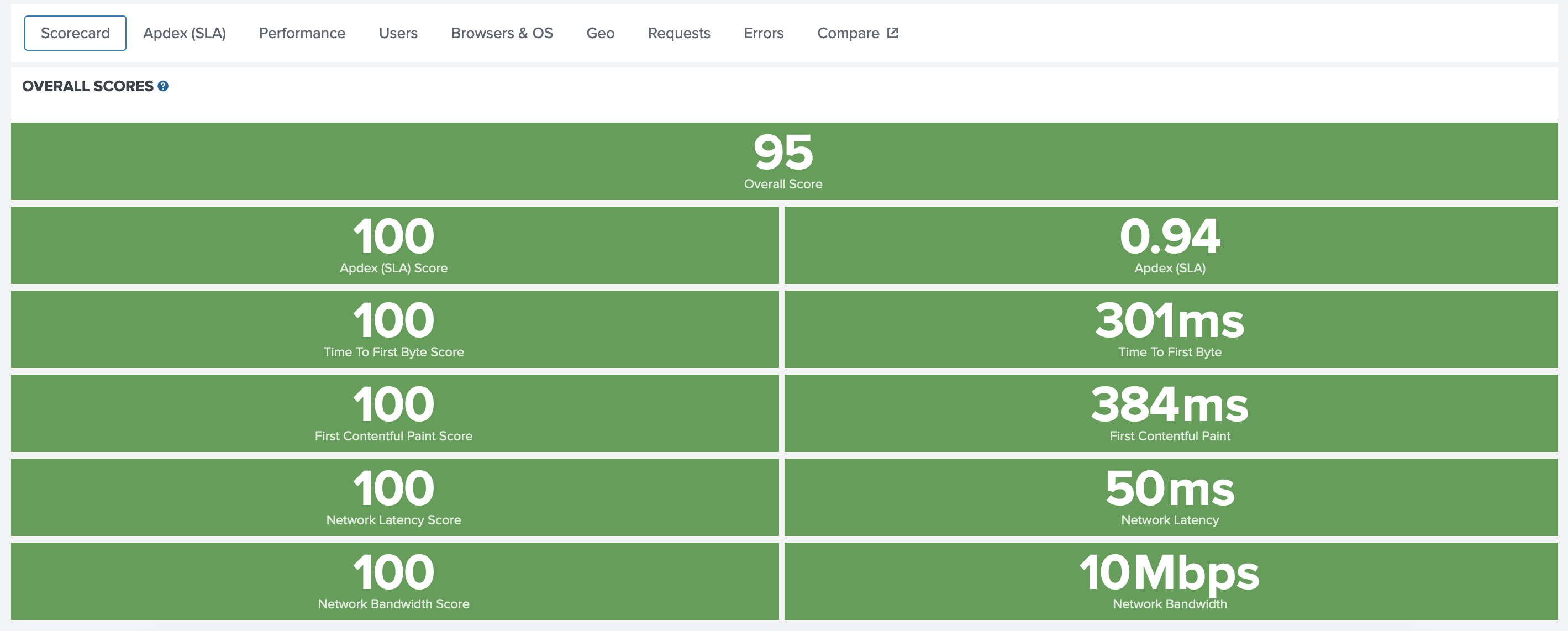 General overview of web application's performance. Displays the overall scores for Apdex (SLA), Time To First Byte, First Contentful Paint, Network Latency and Network Bandwidth metrics.