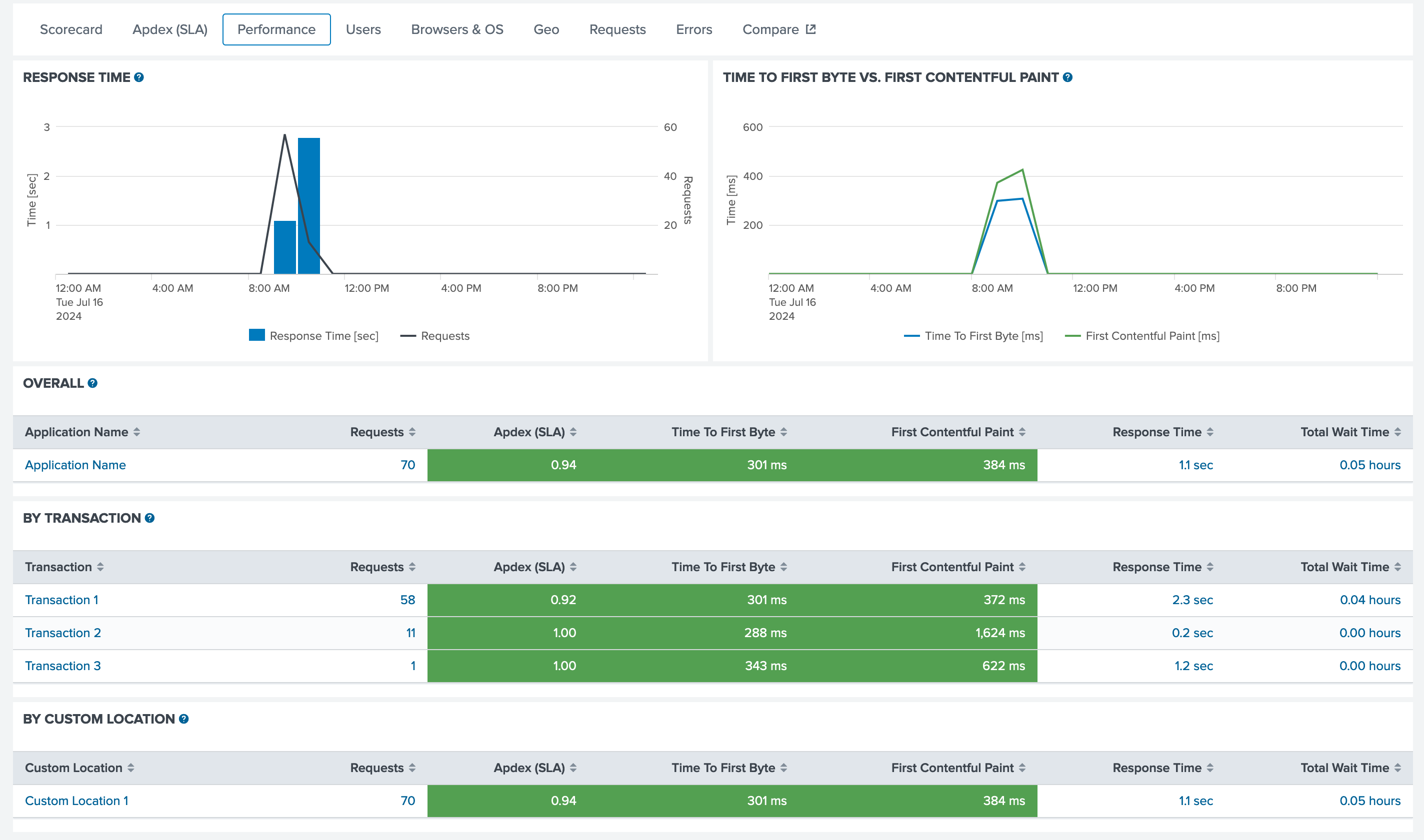 Web application's performance analysis with the overall data, transactions and custom locations. While navigating in this tab, click any table's row to access more details.