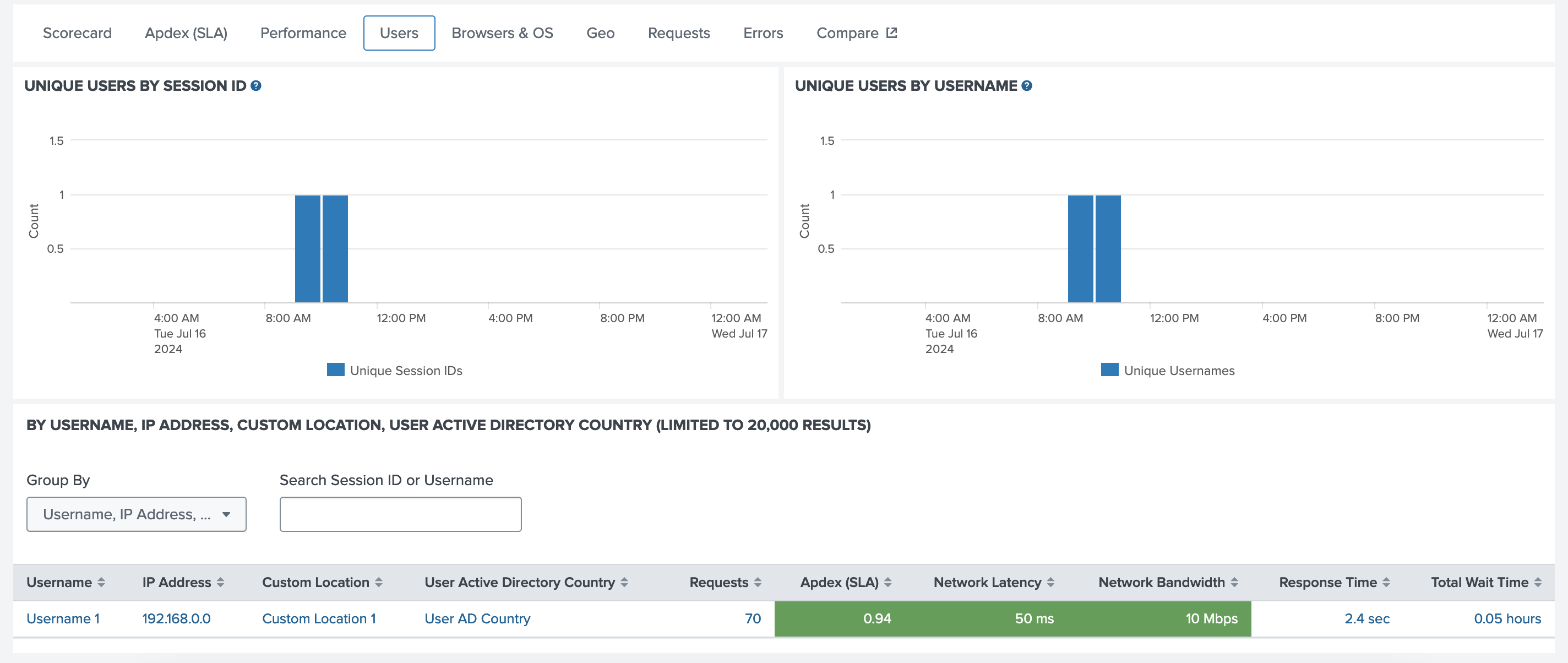 Displays data regarding the user's network information. Use the Group By option to split data by different dimensions, such as: Username, IP Address, and Locations.