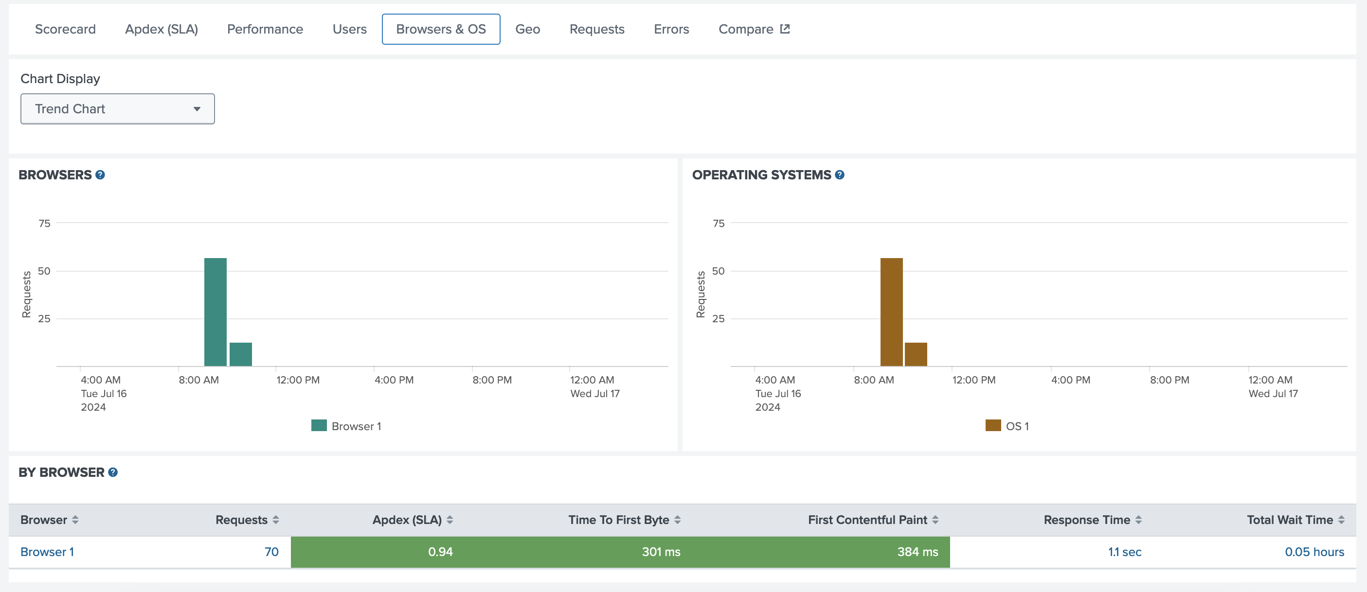 Access information related to the browsers and operating systems running the monitored web applications. Using the Chart Display option will switch the graphs between Trend and Pie.