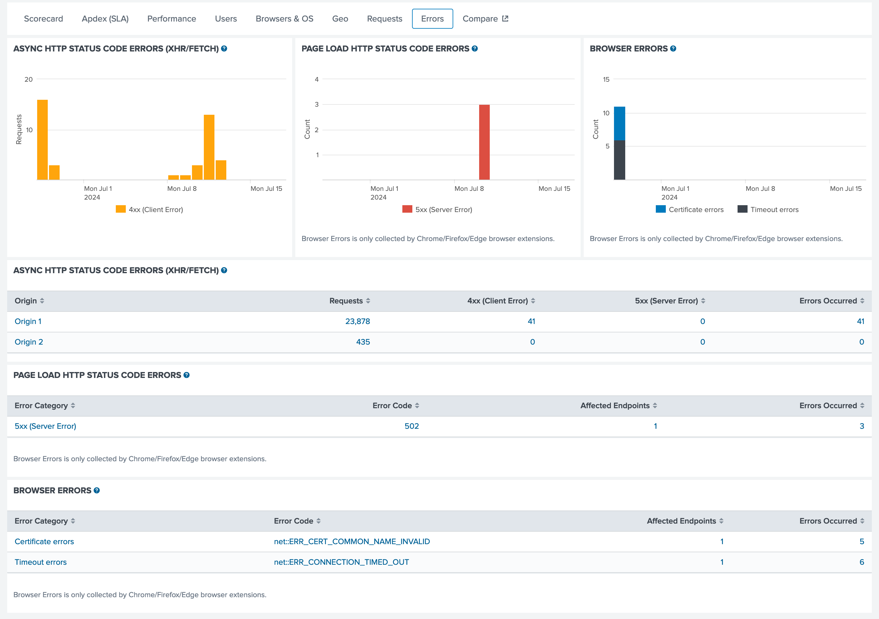Access web application's errors data generated by requests and browsers. When analysing data in this tab, click the table's row to drill down into more details.